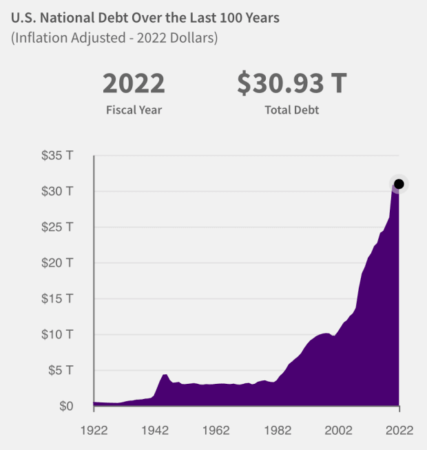 As of October 13, 2022, the United States has $31,144,952,729,330.20 worth of outstanding debt. This is updated daily by the Treasury. To make the math a little more simple, let’s just call it $30 trillion. After all, what’s another trillion, give or take?