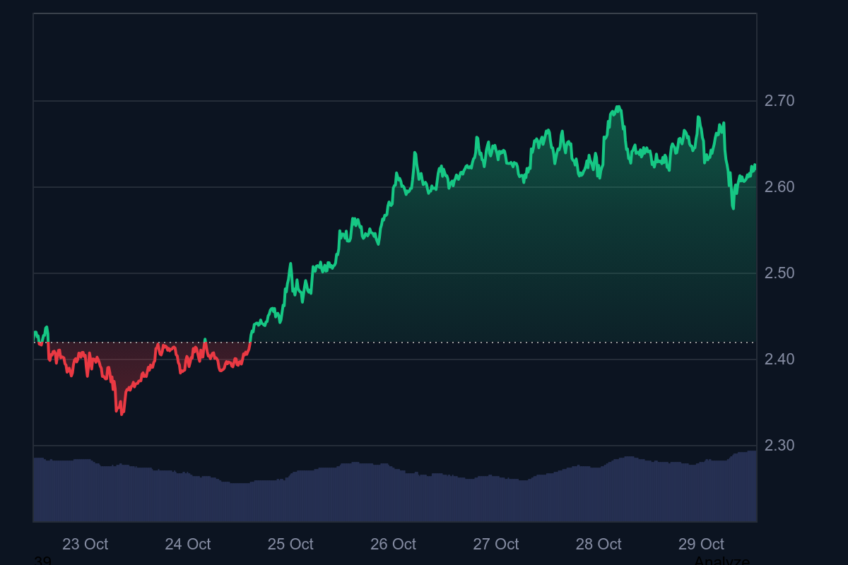 XRP has posted weekly beneficial properties of 8%, outpacing different top-ten cryptos. On the time of writing, the third-largest crypto – excluding stablecoins – was buying and selling at US$2.62 (AU$3.97).