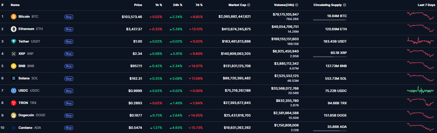 The crypto market appears to have circled for now, with Bitcoin stabilising over US$100k (AU$153.5k). Most main cryptocurrencies are within the inexperienced, with XRP, Solana and Ethereum all making positive factors above 5% on the each day chart. BTC, in the meantime, gained 2.2%, buying and selling at US$103,573 (AU$159,074) on the time of writing.