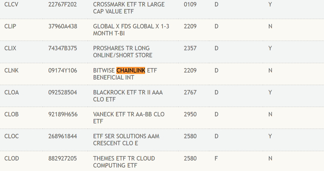 - Bitwise Spot Chainlink ETF (CLNK) has been listed on the DTCC registry in “energetic” and “pre-launch” classes, a key step towards potential buying and selling.