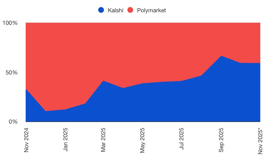 All through 2025, Kalshi has steadily elevated its market share. After beginning the 12 months at round 12% market share, Kalshi achieved a excessive of over 66% in September, and it presently sits at slightly below 60%.