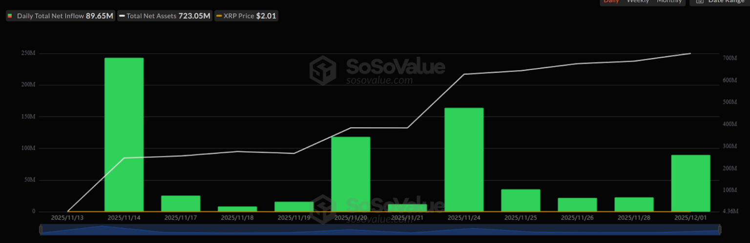 Knowledge from SoSoValue exhibits that US-listed spot XRP ETFs introduced in US$89.65 million (AU$137.16 million) on Monday, taking whole web inflows since launch on Nov. 13 to US$756 million (AU$1.16 billion). Property below administration now stand at about US$723 million (AU$1.11 billion).