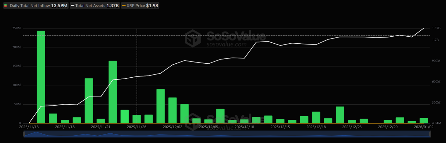 US spot XRP ETFs recorded US$13.59 million (AU$20.7 million) of internet inflows on Jan. 2, lifting cumulative inflows since launch to about US$1.18 billion (AU$1.8 billion), in keeping with information cited by SoSoValue. Merchants mentioned the continuing shopping for has supported XRP in early 2026, whilst broader crypto markets have been comparatively flat.