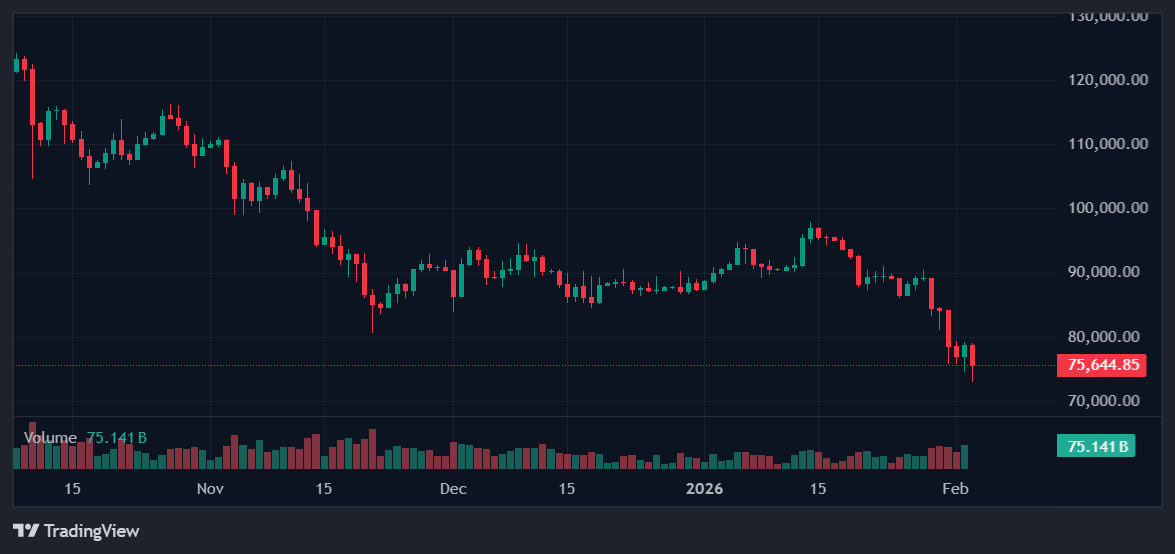 BTC briefly dipped under US$73,000 (AU$111K), erasing beneficial properties since Donald Trump’s November 2024 re-election. The coin is down greater than 40% from its early-October peak, in line with CoinMarketCap knowledge.