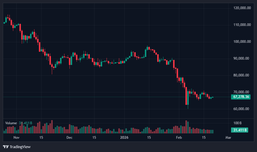 Market sentiment weakened late within the US session after minutes from the Federal Reserve’s January assembly had been seen as extra hawkish than anticipated, pushing each US shares and crypto off earlier beneficial properties. Bitcoin was buying and selling round US$67,000 (AU$102,510), close to session lows and again towards the underside of its latest vary.